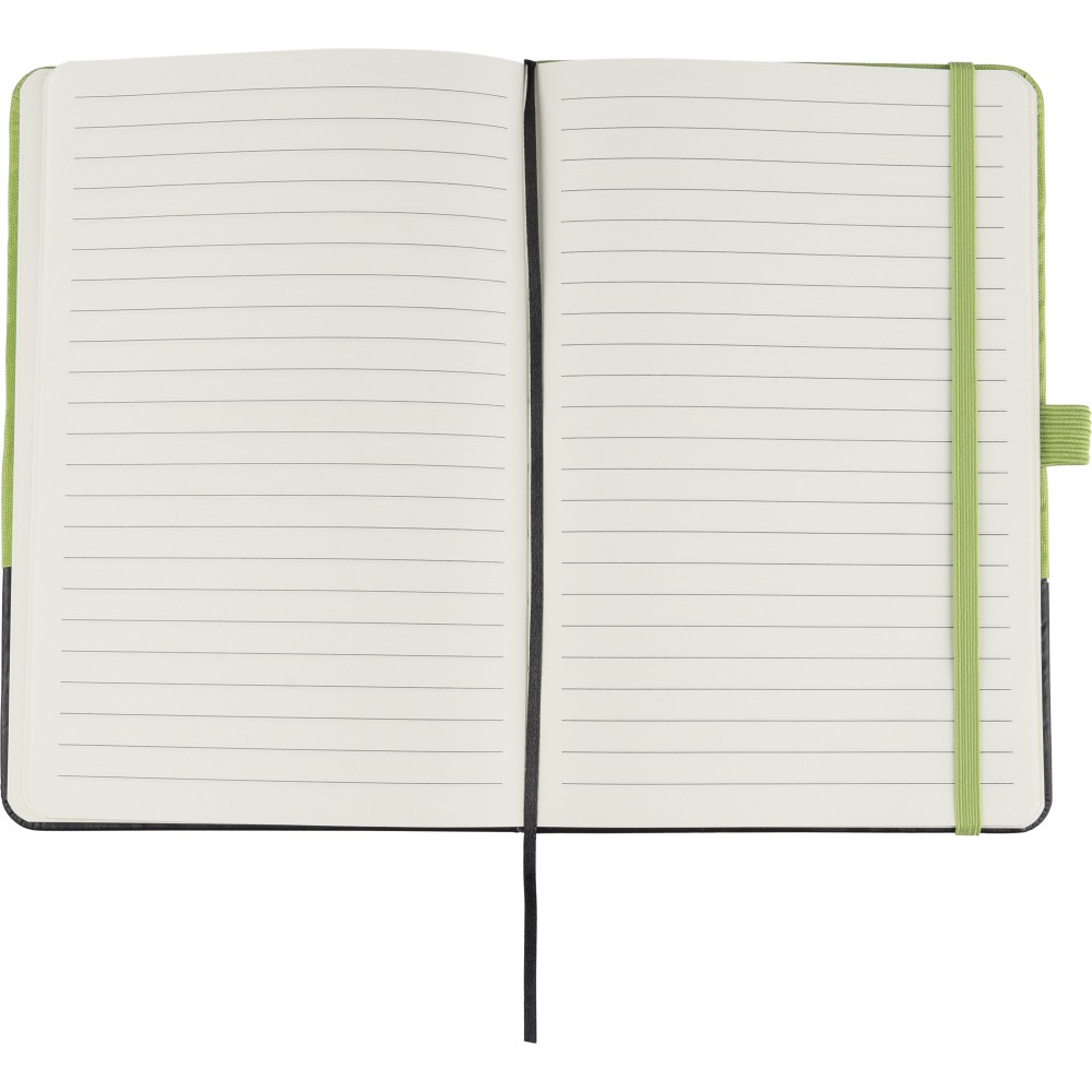 RPET poliészterből készült A5-ös jegyzetfüzet részben lézergravírozható PU előrésszel, amely gravírozás után a borító rPET anyagának színével egyező árnyalatot mutat. 80 lap 70 g/m2 vonalas papírt tartalmaz, gumipánttal, tolltartó hurokkal és könyvjelző szalaggal. Az alsó PU rész gravírozásra kialakítva, amely a megfelelő színt fedi fel.