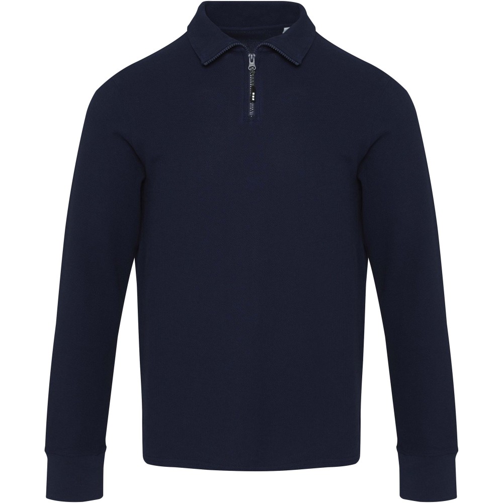 A Zeus uniszex hosszúujjú, félcipzáras felső egész évben kényelmes viseletet biztosít. Anyaga piqué kötésű, amely kellemes tapintású és tartós kialakítású. A kidolgozást finom pick stitch varrásrészletek egészítik ki, az azonos alapanyagból készült nyakszalag-erősítés pedig hozzájárul a hosszabb élettartamhoz. Az oldalsó sliccek, szintén saját anyagból készült betétekkel, nagyobb mozgásszabadságot tesznek lehetővé. A hőtranszferes márkajelzés cimkementes komfortot nyújt. A termék AWARE nyomonkövetesi technológiával van ellátva, amely egy digitális termékútlevelet tartalmaz, igy biztosítva az átláthatóságot és a fenntarthatósági jellemzők bemutatását. 100% pamut, 245 g/m2.