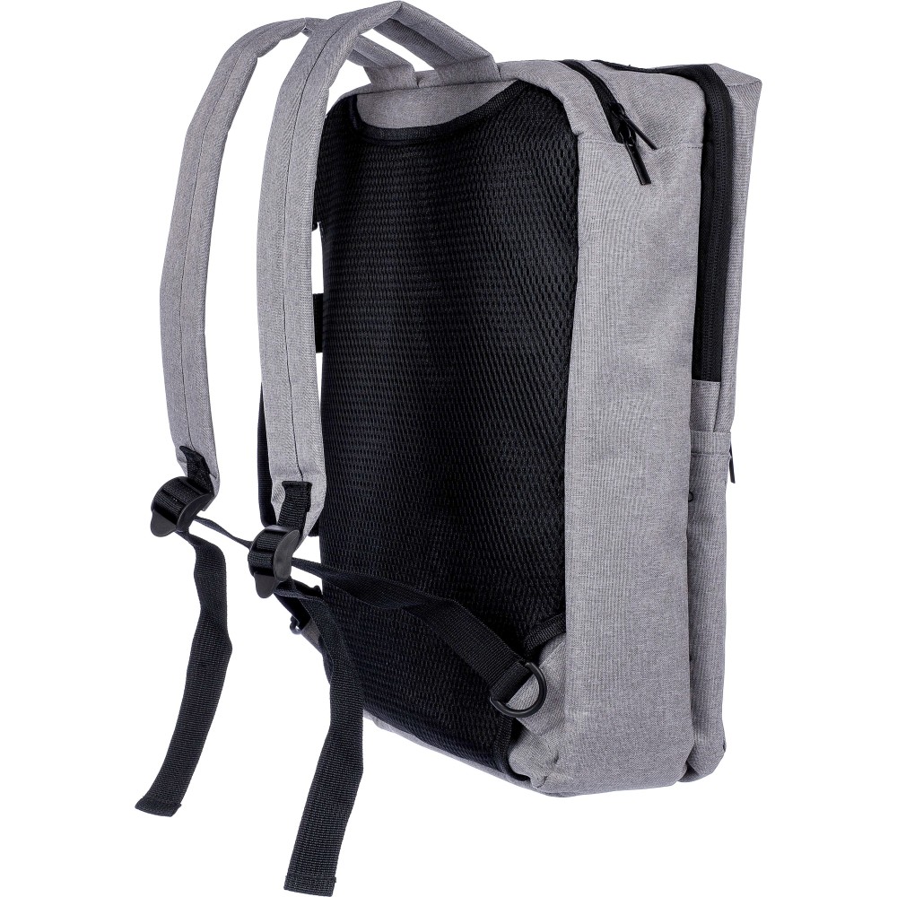 Hátizsák és laptoptáska 15"-es készülékhez. Kézipoggyász méretű. Hordozófüllel a tetején, állítható vállpántokkal és két oldalsó fogantyúval. Az állítható pántok a párnázás mögé rejthetők, így az oldalsó fogantyúkkal is hordozható. Tépőzáras laptoprekesszel és kis cipzáras zsebbel rendelkezik. Szellőző, párnázott hátoldallal. Terhelhetősége kb. 8 kg. RPET alapanyagra utaló címkével. Anyaga: 300D RPET poliészter.
