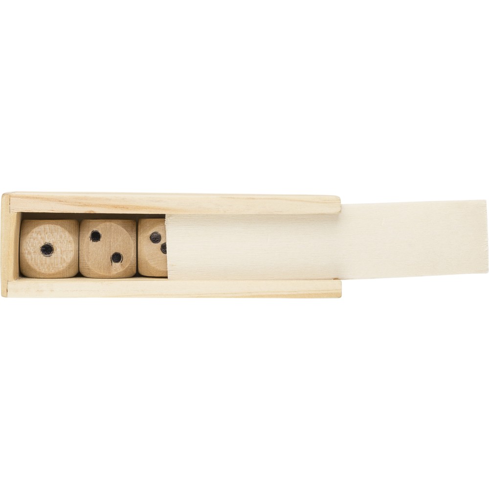 Bükkfából készült, 5 nyomott dobókockából álló készlet hozzá illeszkedő tolófedeles dobozban. Darabonként barna kartondobozba csomagolva.