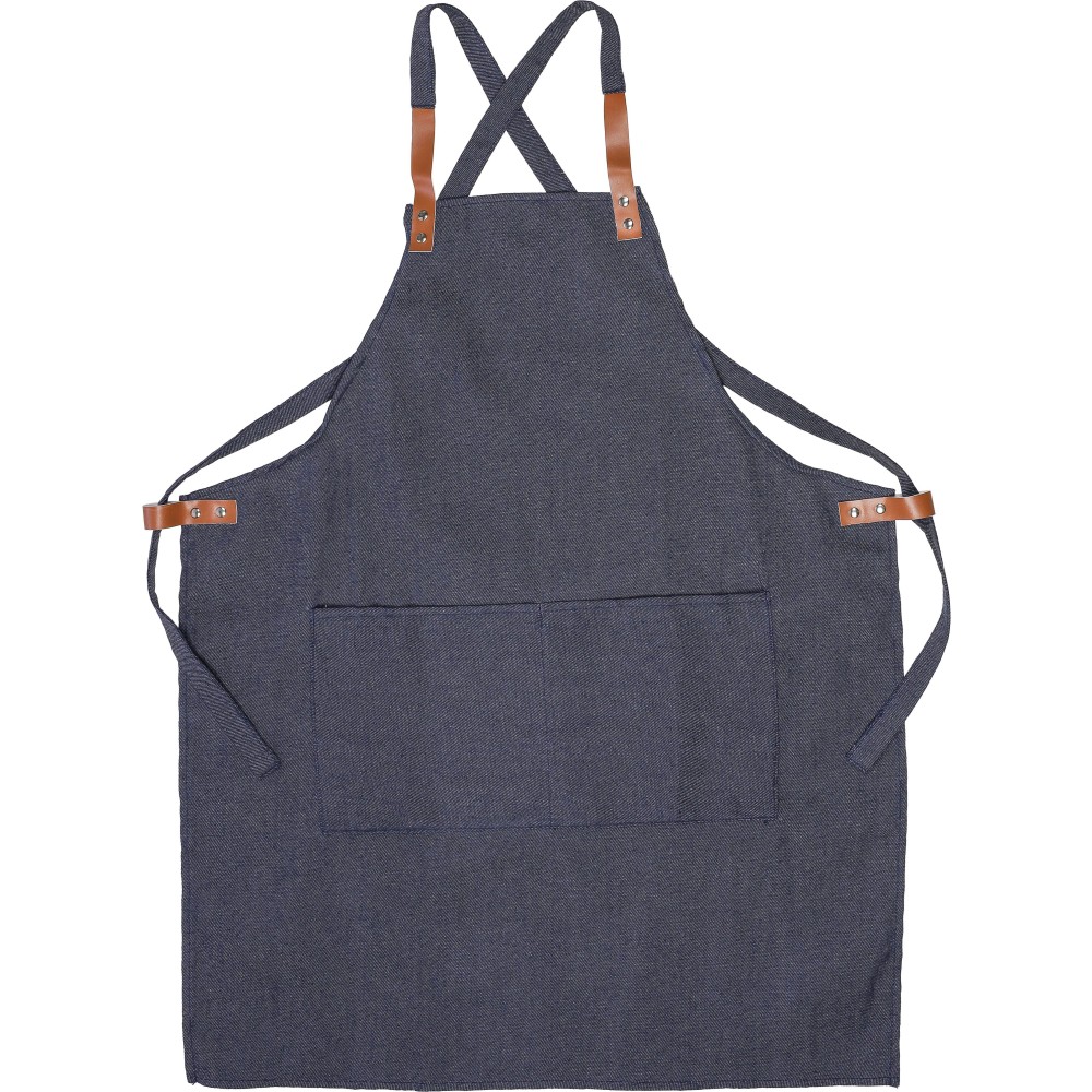 Farmerkötény vállpántokkal és két elülső zsebbel. A farmer 65% poliészterből és 35% pamutból készült. Ez a kötény nem rendelkezik nyakpánttal, csak vállpántokkal. A farmer színtartóssága 2-3 szint. Egyenként barna karton ajándékdobozba csomagolva. Anyaga: 280 g/m2.