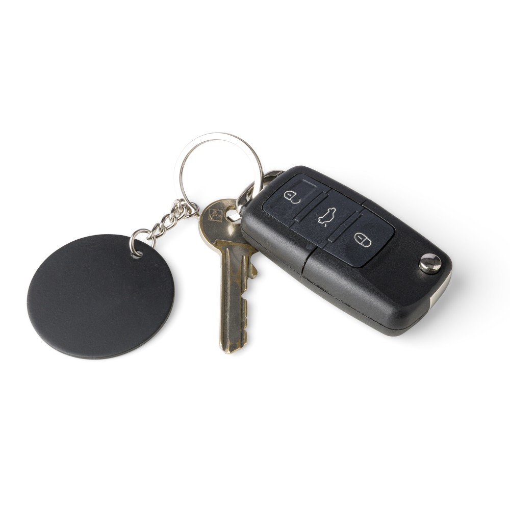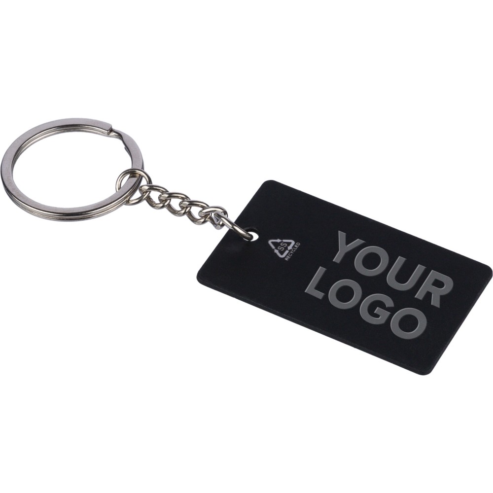 Újrahasznosított rozsdamentes acélból készült, gumírozott felületű, téglalap alakú kulcstartó fém karikával. A kulcstartón gravírozott recycled (újrahasznosított) alapanyagra utaló logó található, amely gravírozás után fényes, tükörszerű hatást mutat. Egyenként kraft papírtasakba csomagolva.