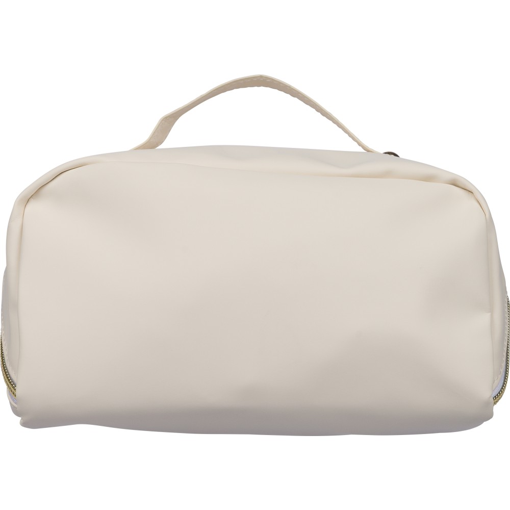 Újrahasznosított PU anyagból készült neszesszer középen elhelyezett cipzárral a széles nyithatóság érdekében. Rövid fogantyúval, tágas belső térrel és négy rekesszel, beleértve egy belső cipzáras zsebet. 210D újrahasznosított béléssel készült, belsejében egy újrahasznosított alapanyagra utaló címkével.