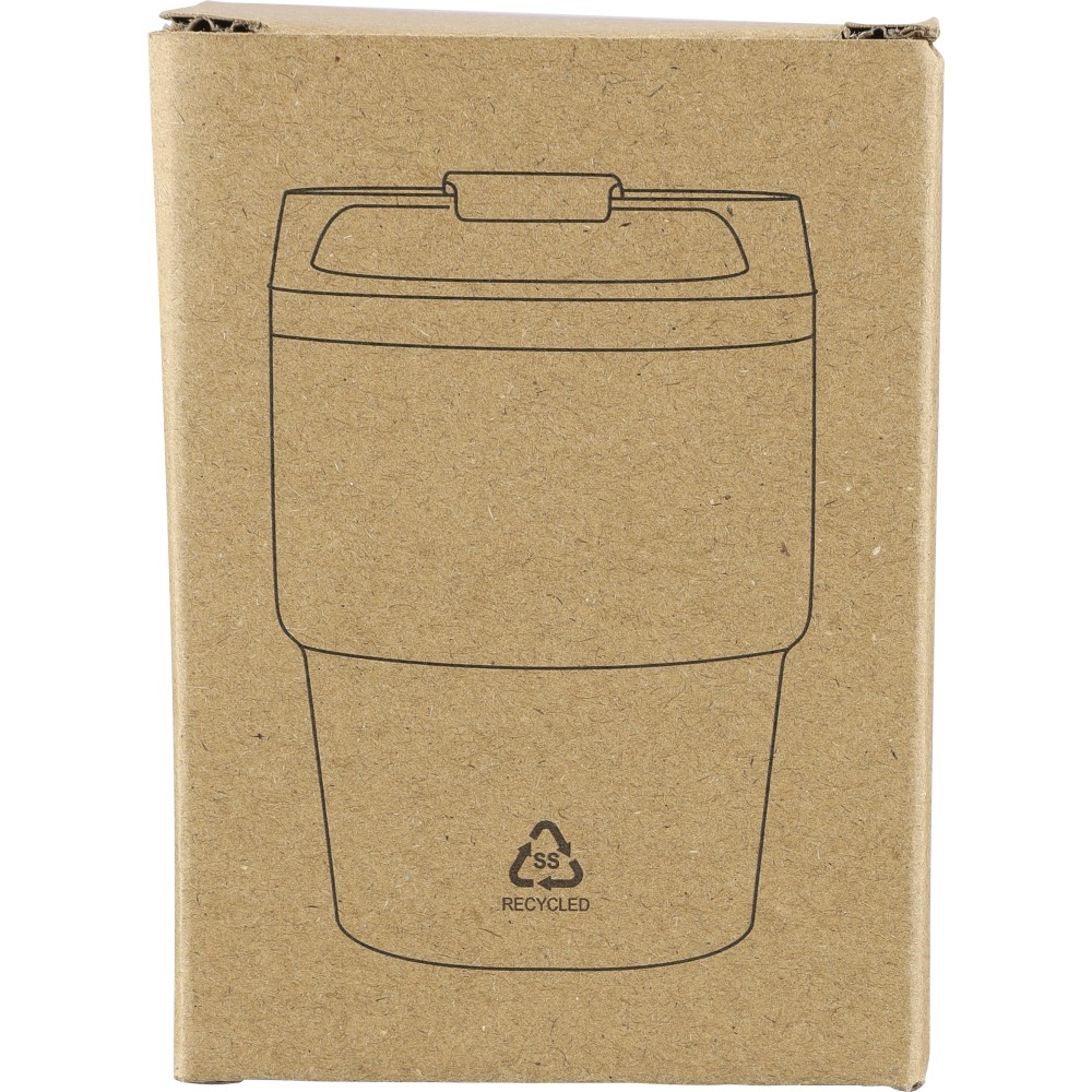Újrahasznosított rozsdamentes acélból készült, vákuumszigetelésű bögre (175 ml) duplafalú kialakítással és porfestett felülettel, PP csavaros fedéllel. A pohártesten lézergravírozott recycled (újrahasznosított) alapanyagra utaló logó található. Kompakt kialakítása miatt a legtöbb kávégépbe illeszkedik, darabonként barna kartondobozba csomagolva szállítjuk.