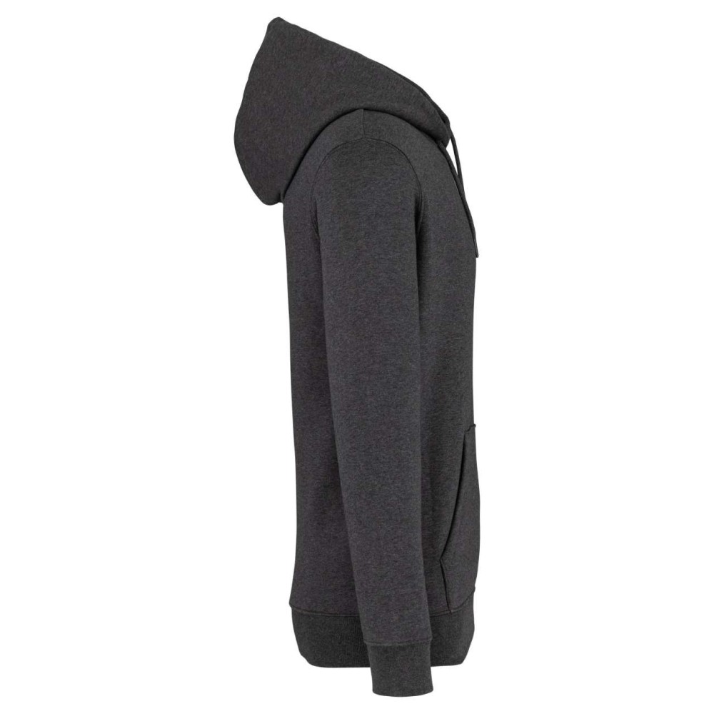 85 % bio, fésült pamutból és 15 % újrahasznosított poliészterből készült. Unisex. Egyenes szabás. Méretcímke organikus pamut és újrahasznosított poliészter logóval. LSF (Low Shrinkage Fleece: előzsugorított polár) kezelés. Kapucni. 1x1 bordás szegély és kézelő. Duplatűzés a kézelőn, a szegélyen és a nyaknál. Szalagozott nyakbelső hátul. Bélelt kapucni, a nyaknyíláson nincs felülvarrás, csak egy megkötés, hogy a húzózsinór a felső részen maradjon. Kerek húzózsinór a kapucnin fém véggel. Kenguru zseb. Nincs márkajelzés a nyakrészen, csak egy méretcímke a könnyű dekorálás érdekében. Karton függőcímkével érkezik, amely felsorolja a termék előállításához felhasznált környezetbarát anyagokat. Organikus pamutfonal. OEKO-TEX N CQ1007/7 STANDARD 100 tanúsítvánnyal rendelkezik. IFTH. 350 g/m2.